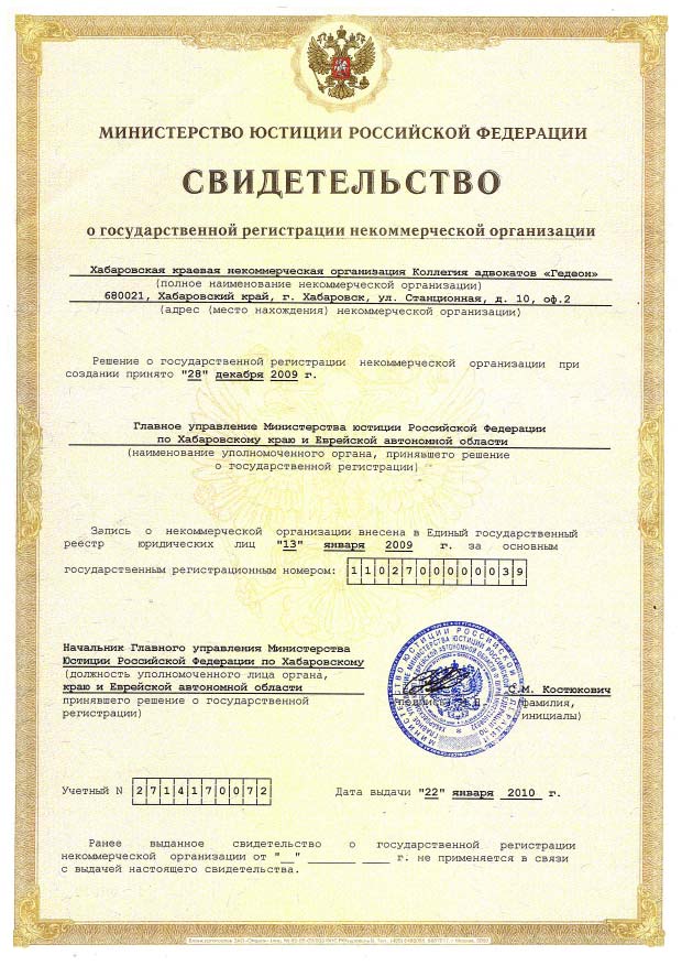 Хабаровская краевая некоммерческая организация Коллегия адвокатов «Гедеон» (ХКНО Коллегия адвокатов «Гедеон») образована на основании решения общего собрания 01.12.2009 года. С момента регистрации и по настоящее время мы находимся в собственном офисе в центре города Хабаровска. Офис оборудован всеми доступными средствами связи и техникой.